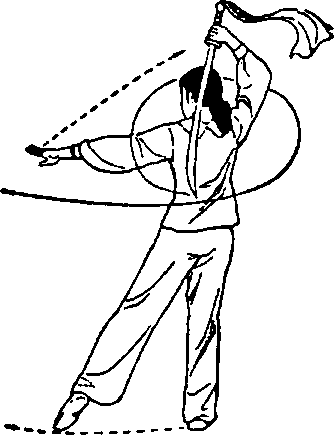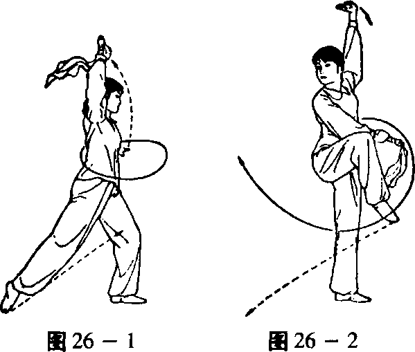 右手持刀臂内旋上提,使刀尖下垂,刀背贴左肩身后向 右肩缠绕。身体重心前移至右腿,随即经体前向左平扫刀,使 刀背贴紧左胁。手心向下,刀尖向后上。刀刃向外下。左掌 向体左侧拉开顺势上架掌于头前上方。同时左腿伸直右腿屈 膝提起成左独立式。眼视右前方。(图26-1、2)