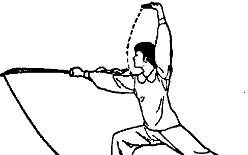 ②上动不停,右手持刀臂外旋,手心向上。使刀尖经上 向后,随即屈肘经头上方向前下按刀。手心向下,刀尖向后,