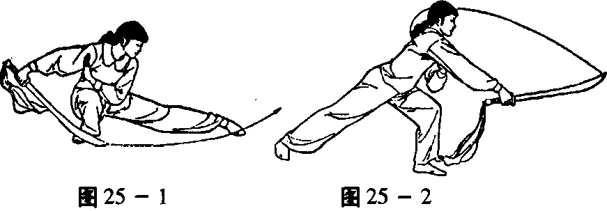 ①上体左转约900 o身体重心移至右腿。右腿屈膝全 蹲,左腿伸膝仆地成左仆步。同时右手持刀臂内旋,使刀尖 里收向左下方。左掌收至右肩前。眼视左前下方。(图25 - 1)
