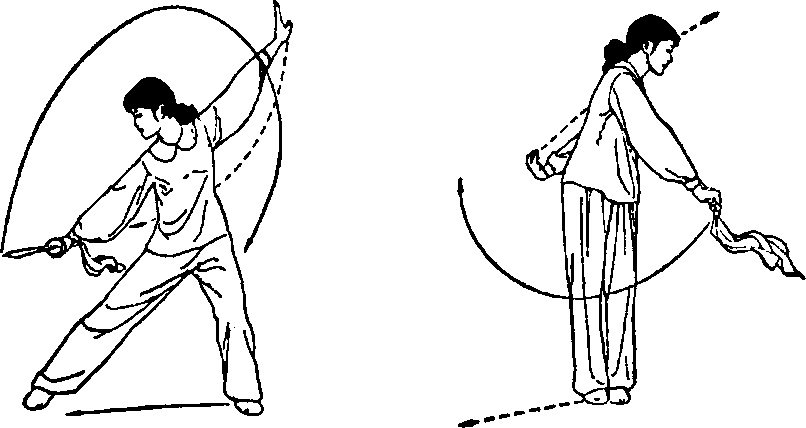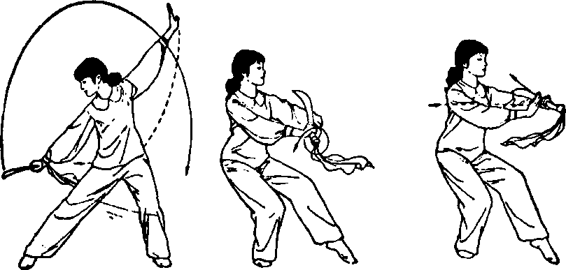 ①右腿后辙一步。同时右手持刀由左胁经体前向体右后 低扫刀。(图27 - 1)