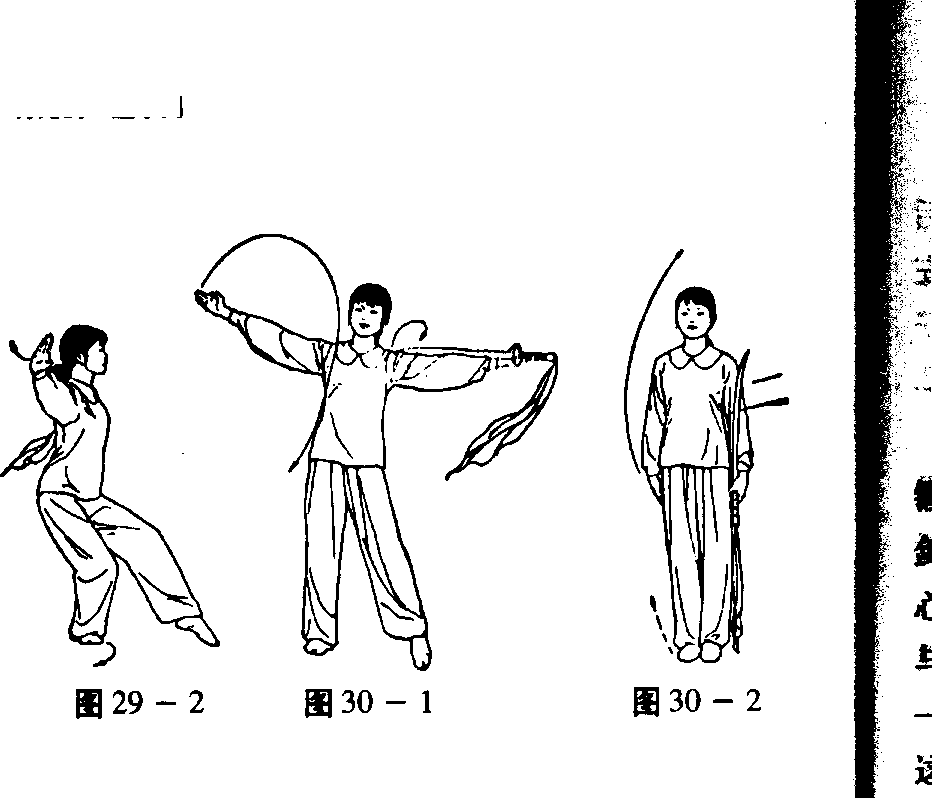 右手交刀左手后变掌开始持刀的左手由里向外经上再向 下按掌于左手腕处。右掌心向前下。随后两臂向体两侧拉开 呈侧平举。左手虎口向上。右掌掌指向上。(图29-1、2)
