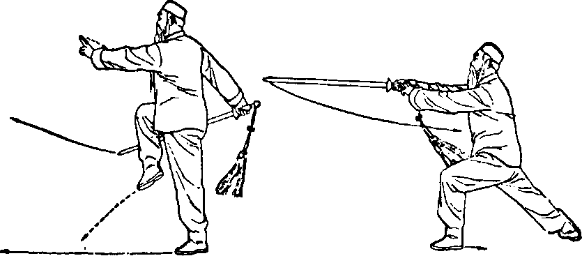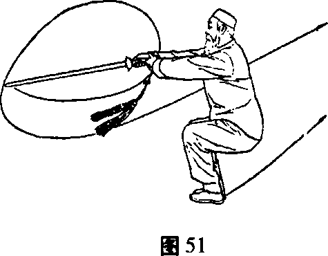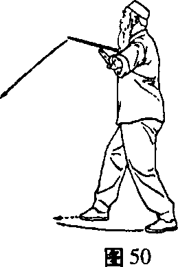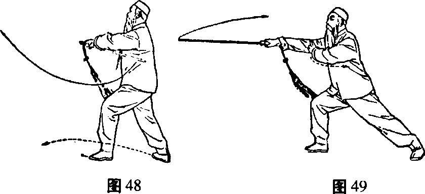 尖向前,手心向外,剑身平刃,力达剑刃外侧,剑尖向前,目 视前方。(图50)