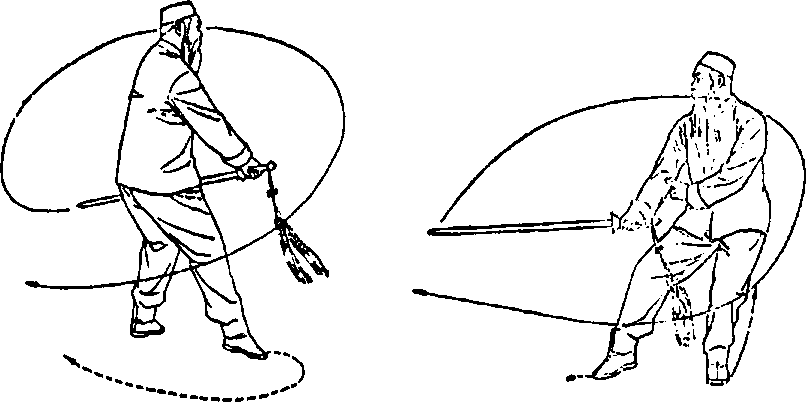 要点:左脚自体后下落至体左前方要与右脚是平行的, 剑的下挂要与落步同时,左手剑指随剑移按于右腕处,下挂 剑要以腕里扣之力自然挂穿。继右后转挂穿不要停顿,身、 步、剑合一,做到一气呵成,要灵活稳健。