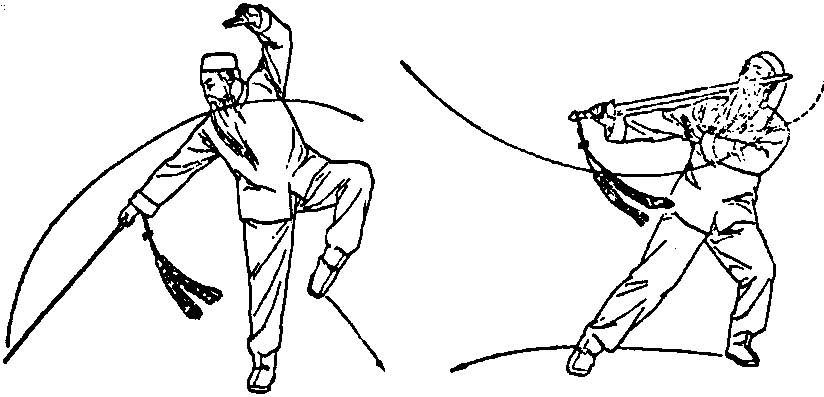 | 左脚向体左后方落步,身体重心左后移,左膝屈,右膝 I自然伸直,右手握剑随左脚落步同时右手稍上翻,剑尖稍向 I右向上云剑至面前,身体同时后仰,右臂自然伸直,右手心 I向前,剑身斜立,剑刃向上下,剑尖向体左方,力达剑刃,左 I手剑指下落按于右肩前,指尖斜向上,手心斜向前,目向上