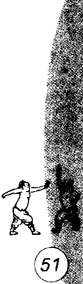 右脚向前进半步,右膝自然伸直,身体上起侧倾向右拧 度,左脚同时向体后屈膝撩起上举,脚底心朝上,脚面绷紧, 右手握剑随身体上起同时右手外翻,手心斜向上,虎口斜向 下,剑身立刃,右肘微屈,一以腕力使剑尖向下向体右后方 向上经体右外侧向前,右手握剑里翻划一立圆剪腕,剑身立 刃,随即剑尖向下向体右后上方抡起划弧反撩,右臂伸直,立 剑剑尖向体后上方,剑身斜立,右手虎口向下,小指一侧向 上,右手心向体后左方,左手剑指同时经体左向头左上方划 弧至头左前上方,指尖向右,手心向上,头向右后转,目视 剑尖。(图52)