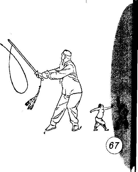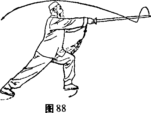 力达剑尖,手心向体左方,右臂直伸,左手剑指随剑移动后, 按于右腕处,指尖朝右腕,掌心斜向下。目随剑尖。(图88)