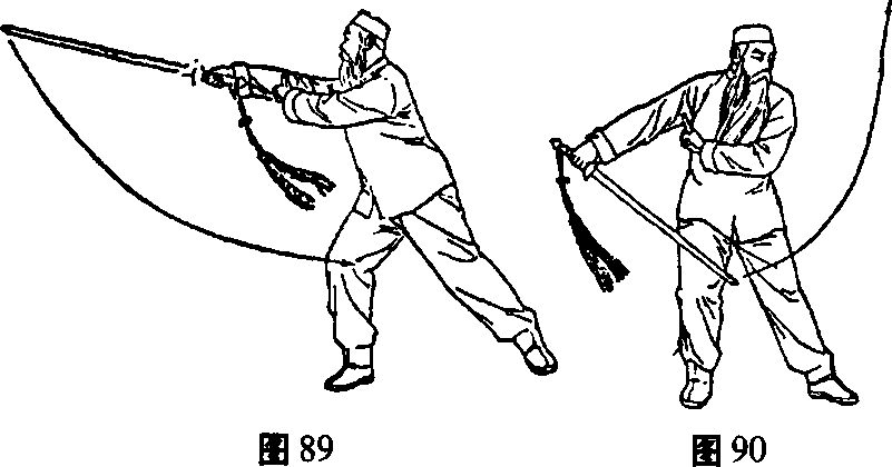 右脚尖外展,左脚尖里扣,身体同时向右转,右膝前弓, 左膝伸直成右弓架,右手握剑随体右转同时手里翻,虎口向 下小指一侧向上,手心向体右外,剑尖稍朝下右肘微屈,随 即向体右后上方劈剑,剑身立刃,力达剑身前端,手心向体 左方,右臂直伸,左手剑指随剑移动,按于右小臂处,指尖 朝右,手心斜向下。目随剑移,视剑尖前方。(图89)
