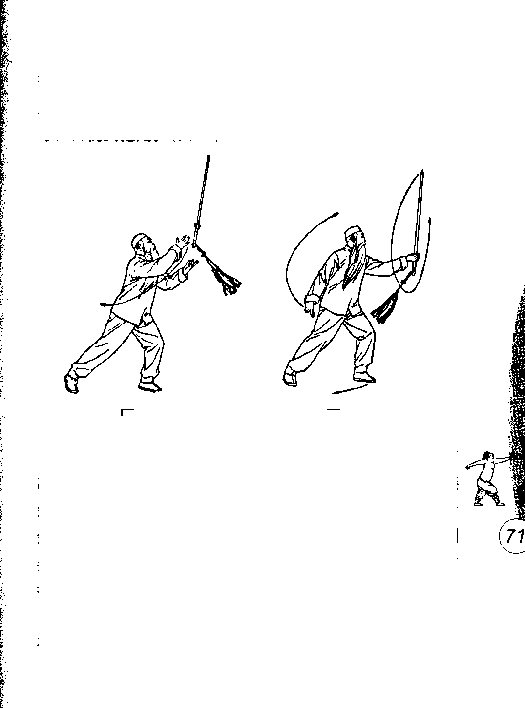 目视剑把处。(图92)目视剑把处。(图92)弓,弓,图91图91图92图92龙 到龙 到①左手外伸在剑下落处,同时反掌向上迎接握剑把,虎 口向下向体左后方,左肘微屈,剑护手落于左虎口处,余三 指贴于剑柄上,剑身平立,剑尖朝上,右手握成剑指状经胸 腹前下落于体右侧,指尖朝下,手心斜向向后,两膝自然屈①左手外伸在剑下落处,同时反掌向上迎接握剑把,虎 口向下向体左后方,左肘微屈,剑护手落于左虎口处,余三 指贴于剑柄上,剑身平立,剑尖朝上,右手握成剑指状经胸 腹前下落于体右侧,指尖朝下,手心斜向向后,两膝自然屈②身体重心后移,右脚向体右后撤半步,屈膝下坐,右 脚向体右里收半步,脚尖点地,屈膝下坐成左虚步,左手接 剑剑尖向体前下落翻向后向上划弧作上立圆,左手食指贴于 剑把上,其余四指扣握剑把,剑身贴于小臂处,剑身平立,剑 尖朝上,右手剑指随虚步及翻剑同时向上划弧至头右前上方 抖腕,指尖斜向体左,手心斜向上,目视剑左前方。(图93)