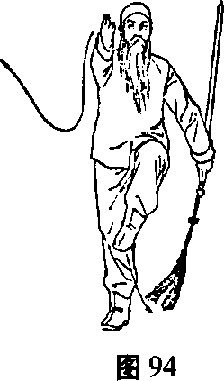③身体上起,左膝上提,右脚踏实独立,右膝伸直,右 手剑指手心向下向体右侧下落划弧至腰际手心上翻,指尖 向前直臂向上撩起至肩平,左手握剑自然相随,目视前方。 (图 94)
