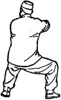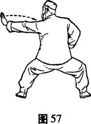 ②右拳里收至腰际抱肘,身体同时右转,左掌经右拳下 向体左侧撑掌。两膝屈下蹲成马步,两脚尖平行站立,目视 左掌。(图57)