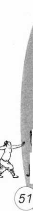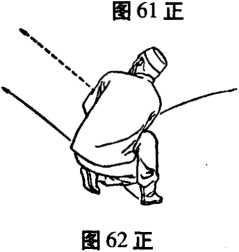 ④身体稍上起,重心右移,随即下沉,左腿屈蹲,左脚 提踵,脚掌着地外碾,身体重心左移,右腿下仆直伸,身体 向左后转,右脚同时向左后扫踵一周360度,左脚踏实,仍 成马步,右拳同时向后随扫腹贯拳,左掌按于右腕上。目随 扫踵向左平视。(图59, 60, 61正、反)