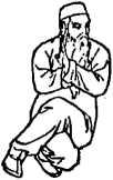 身体稍上起,右脚提起向左脚后插步,身体重心下沉,两 膝屈全蹲下坐成歇步,同时两掌经面前向上向左右作弧形分 掌,随即里收于胸前,两掌交叉捧掌,左掌在外,右掌在内, 掌指向上两掌心向左右,目视前方。(图62正、反)