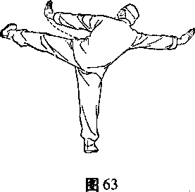 勾起,身体向体侧倾斜,同时两掌经胸前左右撑掌,掌跟用 力,两掌心向外,掌指向体前方,目视左前方。(图63)