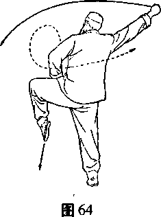 身体上起,右腿自然蹬直,右脚踏实,用力支撑成独立 步,左脚屈膝提起,随即向体左侧踹腿,脚跟用力,脚尖横