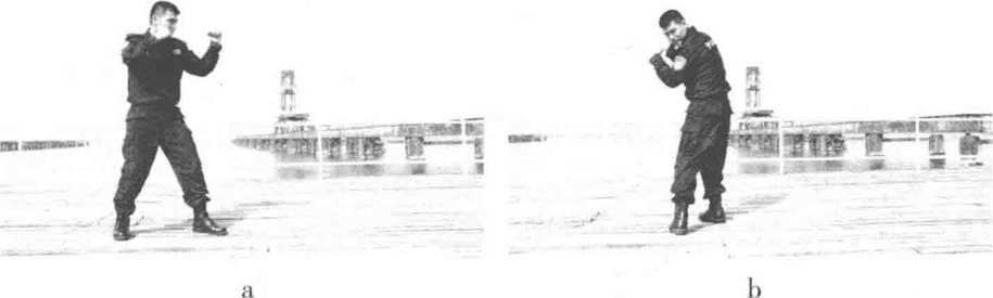 后撤防守技术(见图5-80)。当对方使用左转身后摆腿进攻时,我 方随即后侧,躲开对方进攻。