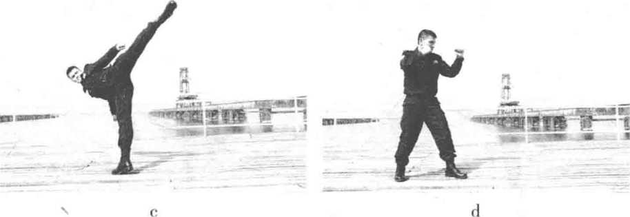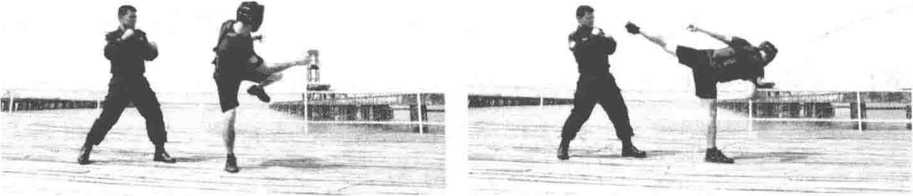 后撤防守反击技术(见图5-81 )o后撤后,分别使用右低鞭腿或左 高鞭腿等动作进行反击。