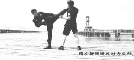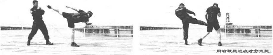 维和警察结合步法,进行该腿法的练习,待动作熟练后,可两人 一组进行腿靶的练习,持靶人可根据练习维和警察对动作的掌握情况, 不断变换靶位,使对方在移动中找寻准备的击打点。