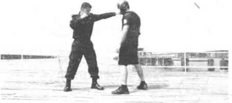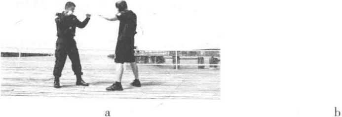我方主动进攻时的运用:用左直拳进攻后迅速下潜利用抱腿前顶动 作将对方摔倒,如图6-2所示。