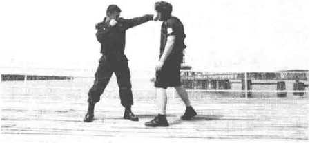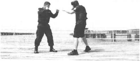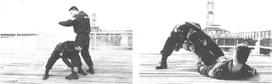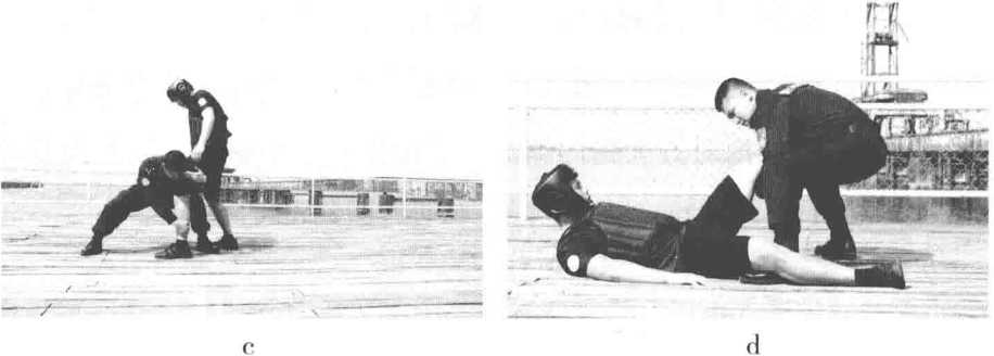 我方主动进攻时的运用:我方用左摆拳进攻对方后迅速下潜用抱腿 旋压动作将对方摔倒,如图6-4所示。