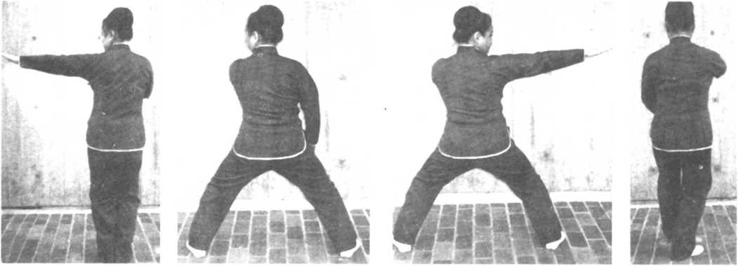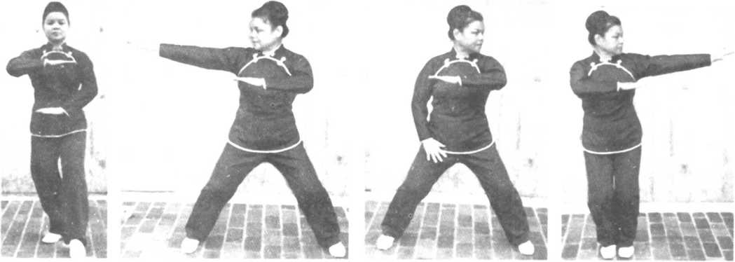 从左式回复至右式:左掌心向下,降至与胯相平,随即循弧线由下提上移至胸前,屈 肘成正方形,右手向右平肩伸出,掌心仍向下,同时左脚向左横移一步,成骑马步,回复 右式姿势。