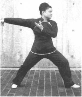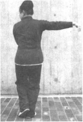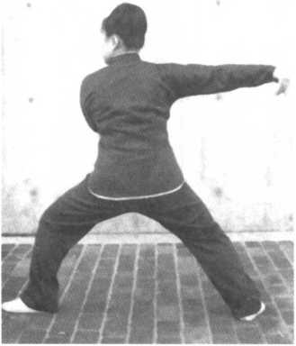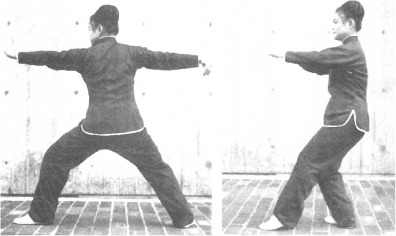 转身向左,左手与左脚随即转身势收回,左脚收回半步,脚跟提起,左手向前伸直, 掌心向下,高与肩平,同时右手放开抓拳,平移至左,掌心向下,左手指尖在前,右手指 尖稍后,肘微屈。同时右脚尖转至45度对角线,重心置于右腿二