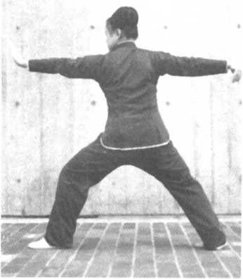 左脚落地置于右脚后,两手仍回复斜十字形一