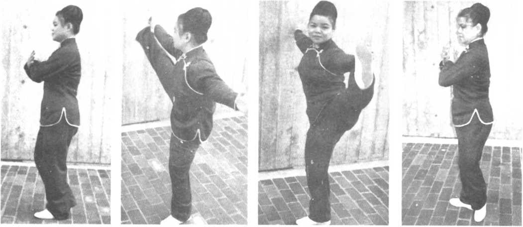 右脚落地立足,左脚置于右脚内侧,脚跟提起,同时回复斜十字形