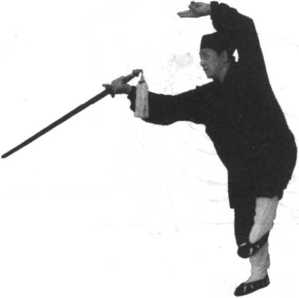 此式与前式“悬针垂露”要有机联系。 左剑指领剑向后划弧时要用腰身带剑,以 达到剑身合一。向前刺出时,左脚提膝扣 脚与剑指上举要同时完成,才能达到神形 一体。