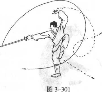 紧接上式不停,身向左转90° ,右脚向右前 进一步下落,脚尖微向里扣,踏实;左脚提起抬 膝紧跟右腿后,脚尖向下垂贴在右膝内侧成右独 立式;同时,右手持剑,剑尖速向身左后侧穿挂, 向下、向左、再向上翻转一立圆,成翻手反立剑 “中阳剑”势,手心向右,向右前刺出,剑下刃向 上;左手剑指在翻转剑时向左后划弧,再向上屈 肘上举,置于左额头上方,手心向外,眼视剑锋 (图 3-301)。