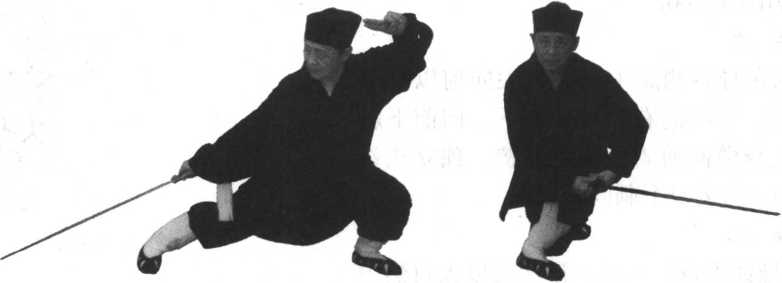 “夕阳普照” 一式,其意是指落日普照 着大地。在剑术动作上,要做到剑向左贴 身后挂,反转调头剑尖圈圆一周,再向前 刺,实如夕阳在普照大地,显得格外柔和。此剑法为探刺剑,属主攻剑法。