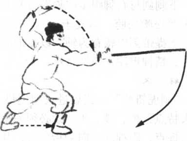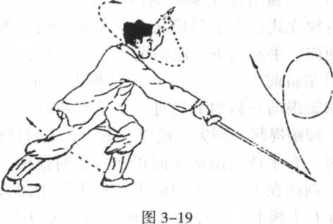 剑下圈向上撩挑,要撤步抖身上撩, 圈剑下砍后要速变平扫,再抽剑前刺,中间不要停顿,必须连贯完整,要以剑代
