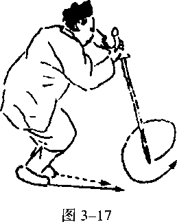 手持剑,剑尖在右上向里、向外旋转一小 圈剑花,然后从右上斜向左下砍至左肋外侧,剑与腰平。然后速翻转臂腕手向下 成俯手平剑“太阴剑”势,由左向右肋侧平扫横击。右脚提起向右后倒退一步, 身微向右转,左手剑指随砍剑下落向前指,眼视前方(图3-13)。