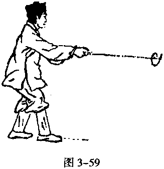 4. 上动未停,紧接右手持剑从前方微向 回抽,身体以腰为轴,迅速先向左再反向右 快速旋转;同时,右手持剑随身摆动快速向 左再向右、向前圈缠搅剑早刺;同时,右脚 随腰转速向前进一步,脚尖向前;左剑指仍 附于剑柄后,随动作行止,眼视剑尖前方 (图 3-59)。