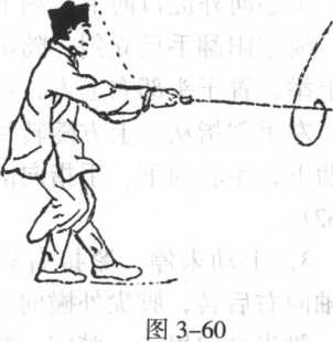 5. 上动未停,紧接右手持剑从前方微向回 抽,身体以腰为轴,迅速先向左再反向右快速 旋转;同时,右手持剑随身摆动快速向左再向 右、向前圈缠搅剑平刺;同时,左脚随腰转速 向前进一步,脚尖向前;左剑指仍附于剑柄后, 随动作行止,眼视剑尖前方(图3-60)o