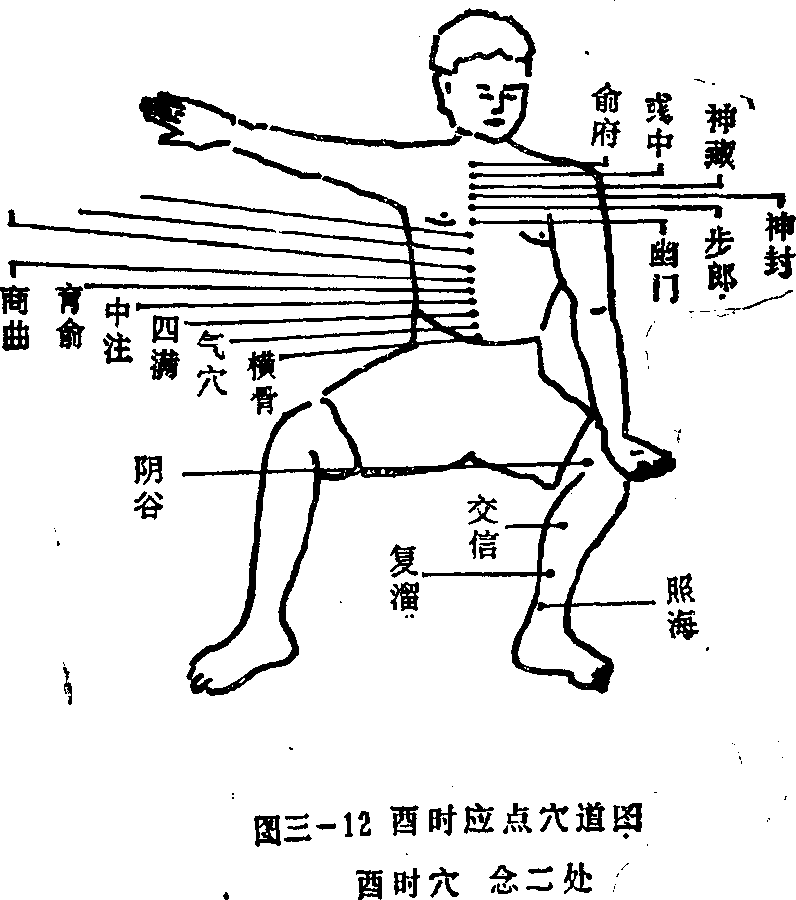 图三一11申时应点穴道图申时穴在左膂按擒拿怕大抒京通谷幽门部图三-13戌时应点穴道图戌时穴共七穴点天池将盖雪图三-14亥时应点穴道图亥时