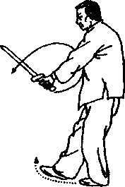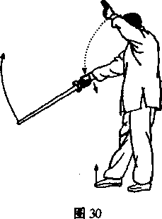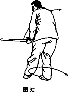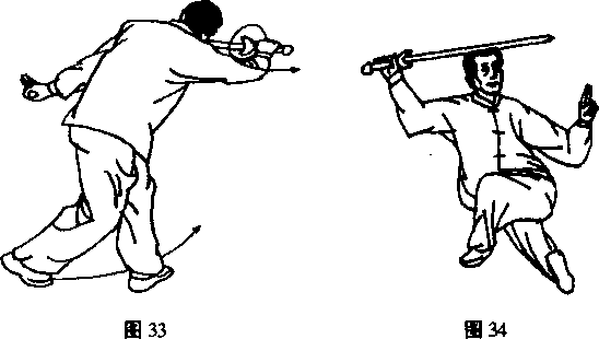 (3) 砍:身向右转,右足外撇,横上左足;同时以右腕为轴 逆挽右旁花向西砍平。左戟指仍扶右腕。目回视剑端。(图31、 32)