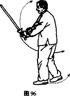 落实左足,身右转至面向东,右足向东偏南落步,左足跟外 摆成右弓势;右手剑以肩为轴由东向下、向西与左臂交叉扭过身 来两臂分开向东劈平,左戟指翻上停于左额旁。(图98)