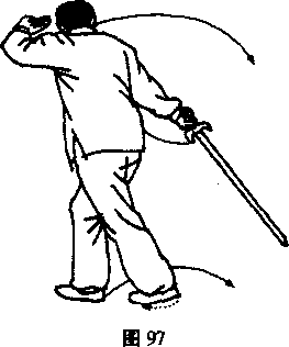 撤一小步(图*);右手剑继续向下、向后练)撩,由顺手剑把 变逆手剑把,重心移于右足,左足迅速向后(东)倒插,足尖着 地,身朝西,头向东回视剑尖。左戟指上扬至左额旁。(图97)