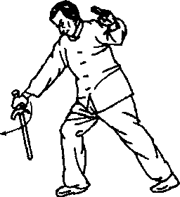 把剑尖向西南此时腕部放松紧接着向西北一抖如同疯魔乱扫地一般。此时左足后撤一些成低架大步右弓势。左戟指在抖剑圈时上扬至左额旁