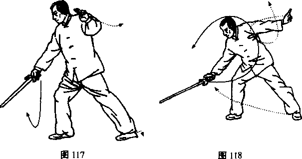 随腰先左后右转右手剑先抖一逆转的立剑圈抖完成阴手剑把剑尖向东南(图116)接着再抖一顺转的立剑圈成阳手剑