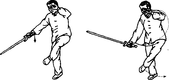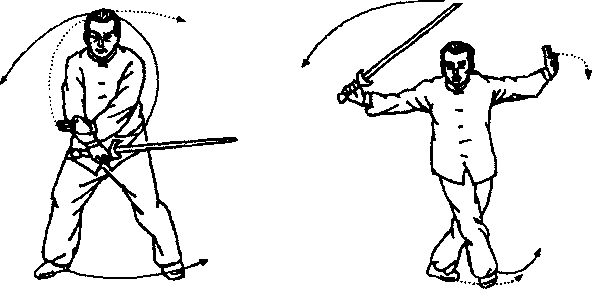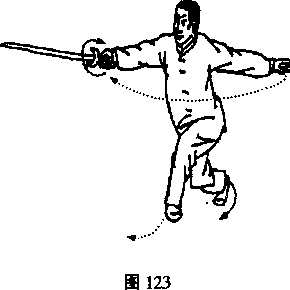 接上势左戟指向外(左)、向下走逆向弧线持剑腕逆转变阴手剑把向下抄至腹前与左小臂相交叉同时左足向东落步重心移至左腿(图121)紧接着两手向上翻右足经左膝前向东跨步左腿赶紧向东出步随即两臂向左右分开平伸此时右