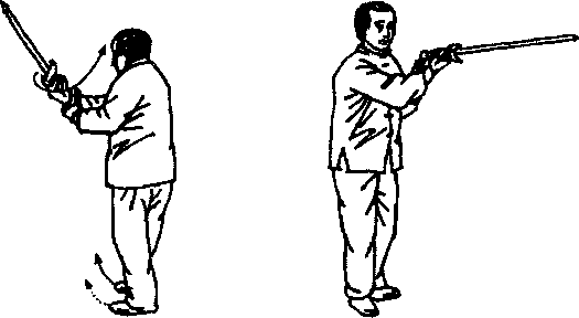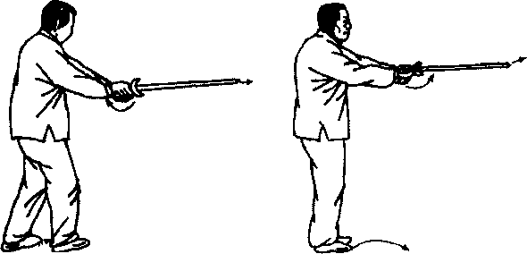 含胸拔背以腰带动剑锁顺转由北而东再由南收到胸前向东双手捧剑以平面剑向东剌出口随转腰随起身同时右足外撇向东上一小步(图129)刺出时左足向前趋步与右足并齐口捧剑时身略下降刺出时再回升。(图130)