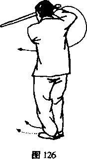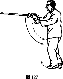 右手剑以逆手剑把向北撩同时向北上右足半步左足跟步(图126)接着以顺手剑把向东劈再以逆手剑把向西撩平,同时左足向西上半步右足跟步。目领之口(图127)