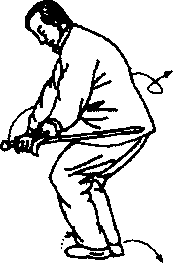 左足向右足里恻并步足尖向北右足以足掌为轴足跟向左摆足尖亦向北双足并齐同时腰向左拧、身下蹲右手剑剑身由匕向后随之以立刃向左侧下压剑缴向北成泰山压顶之势口左戟指扶右腕助之臼目先视剑身再向北视臼(图128)