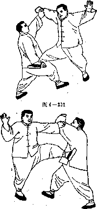 乙在将被踢到时左手随腰腿右转势由右臂下往右抄执甲右手腕同他右手向右下搂(带抄)甲右足(见图4—301)