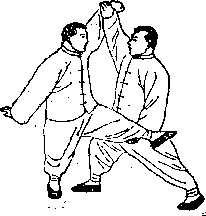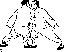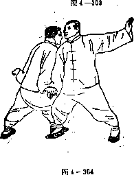 乙在将被靠到时右足略提起右手随腰腿左转势向左往后绕圈化开甲攻势。同时翻执甲右手腕往右向后下采右足随势前进半步以右肩间靠甲右腋部(见图4—305)