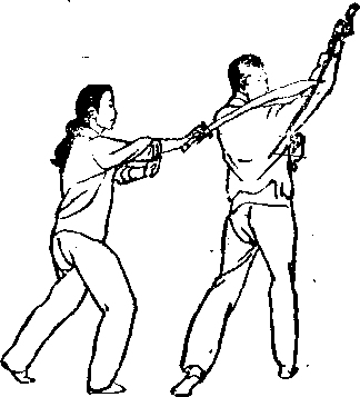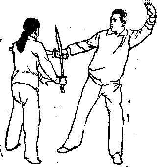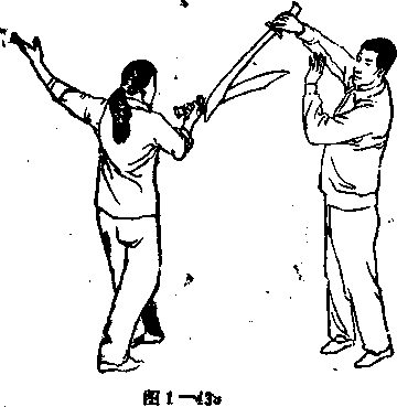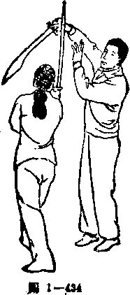 急向前并左脚(右足跟也可微翘起助势)体重移于左施并略向左倾侧躯干。同时右臂随之里旋。吊肘使刀尖由上而下反截乙右腕外1。左手合附于右腕侧。眼注视乙右腕(图1433)