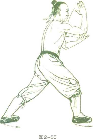 3 .左脚向前跨进一步,成左偏马 步;同时,左掌上托于左肩前上方,掌 心向上,虎口向夕卜,掌尖高与眉平;右 拳变仰掌,从左肘下向左平插,掌心 托住左肘尖。目视左掌,(图2-57)