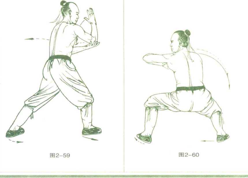 5 .左脚向后撤大步,成右弓 步;同时,右掌上托于右肩前上方,掌 心向左,虎口向面,掌尖高与眉平,肘 向前顶;左拳变仰掌,虎口向前,从右 肘下向右横插,掌心托住右肘尖,目 视前方,(图2-59)
