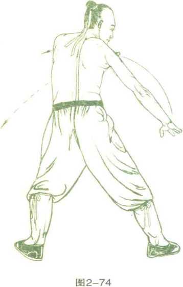 2 .借助腰的扭摆,双腿重心变为 右七左三的偏马步;同时,左右掌经 胸前向左侧甩出D左臂略成弧形,左 掌变俯掌,高与胯平,左臂略伸直;右 掌变仰掌,置于左肩前侧,掌心向L 目视左掌“(图2-75)